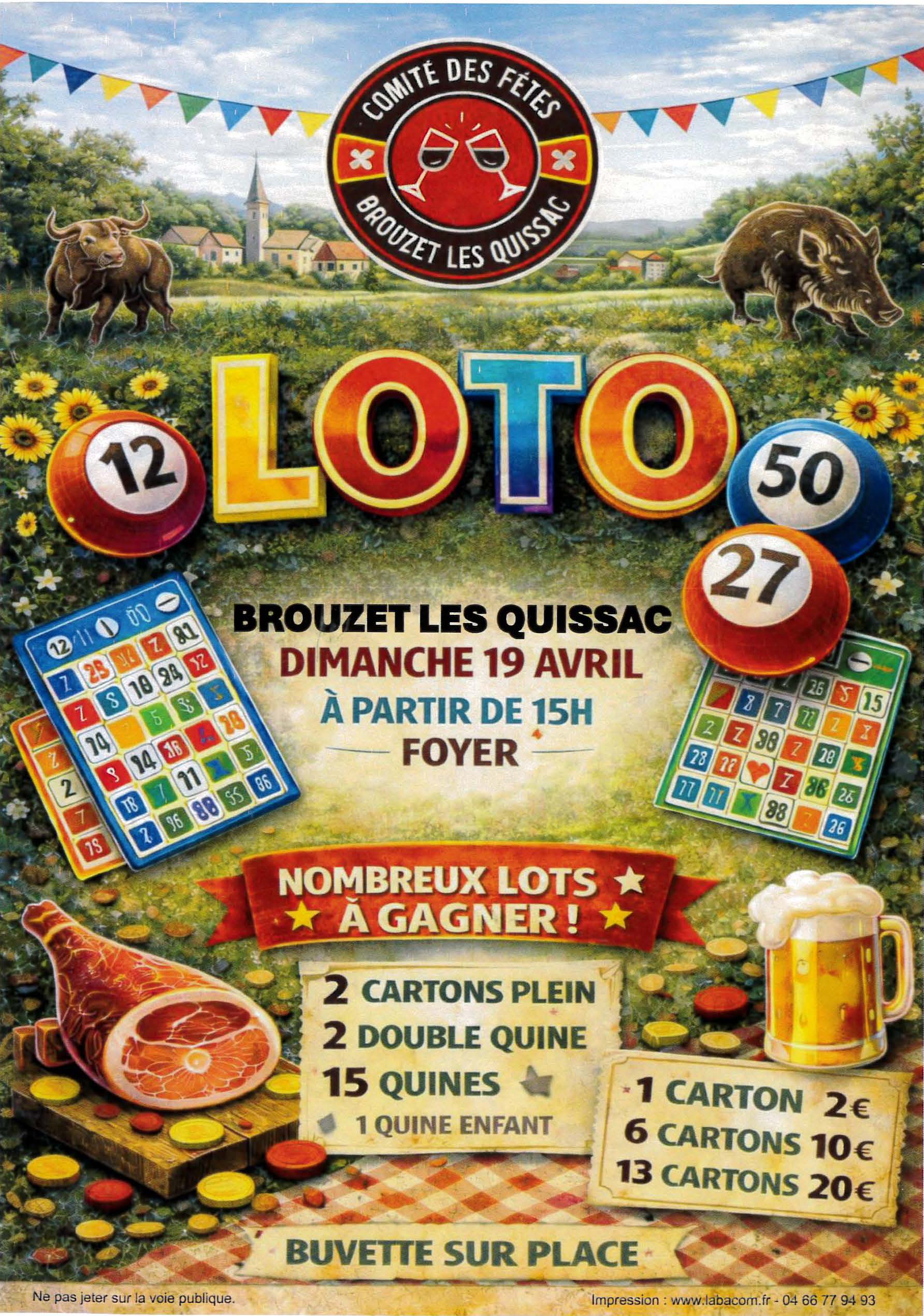 Le comité des fêtes de Brouzet les Quissac organise son loto le Dimanche 19 avril 2026 à partir de 15h au Foyer Communal du village.